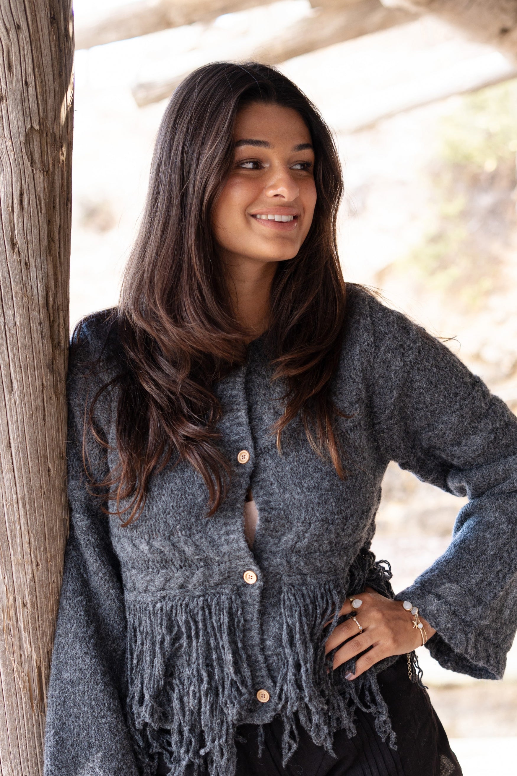Deze Fringe Jacket Daira Dark Grey van ibzmode in het black ademt Ibiza vibes. Fijn gebreid vestje met franjes, sluit met houten knopen Laat de zomer maar komen – jij bent er klaar voor.